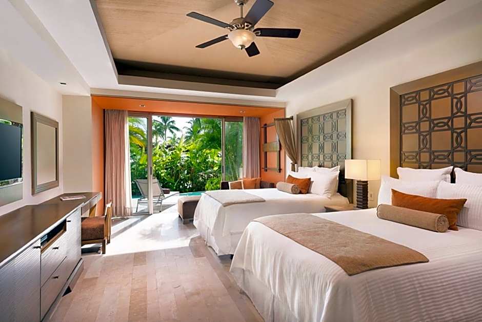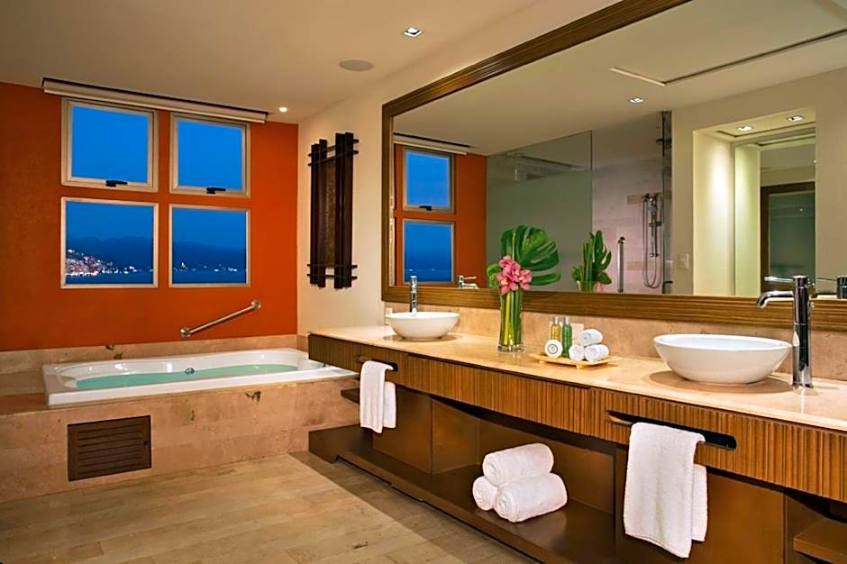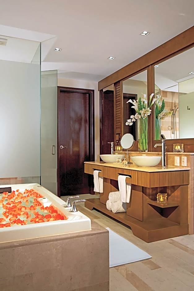 This spacious suite is located on the Preferred Club Floor and features a private terrace overlooking the resort’s beautiful gardens, and includes a hot tub. There is a separate living room with cable and satellite TV, a DVD player and an iPod dock. The private bathroom has a bath tub, separate shower and 2 sinks.
